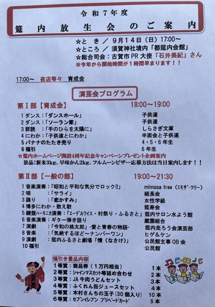 長年9月18日に開催してきた「筵内放生会」を、今年から9月の敬老の日の前日の日曜日(3連休の中日)に開催することとなりました。