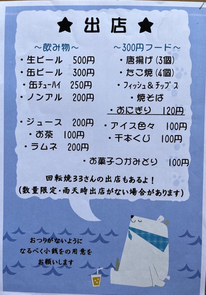 育成会の夜店の出店内容です。17時開店です。お早めにお越しください!!