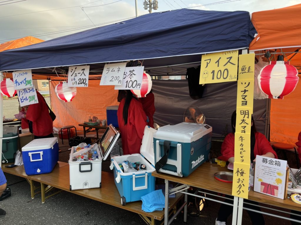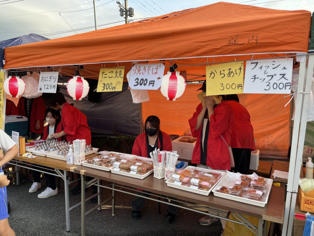 育成会による出店:おにぎり。たこ焼き、焼きそば、から揚げ、フィッシュ&チップスの販売です。