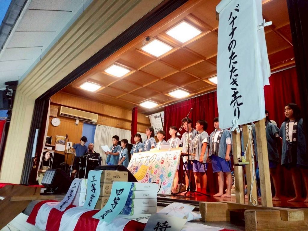 小学校4,5、6年生による「バナナのたたき売り」です。筵内の隣組のネタの口上により、見事に完売しました!!